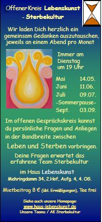 Der Offene Arbeitskreis Lebenskunst - Sterbekultur lädt einmal im Monat dienstags im Haus Lebenskunst ein zu einem Gedankenaustausch.