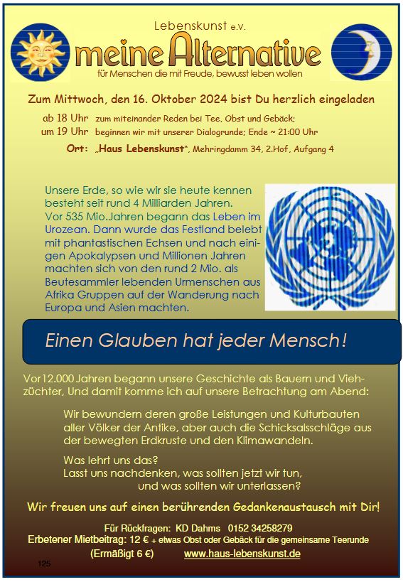 Das Team von "meine Alternative" lädt einmal im Monat mittwochs im Haus Lebenskunst zu einem gestalteten Abend ein, immer mit Gedankenaustausch.