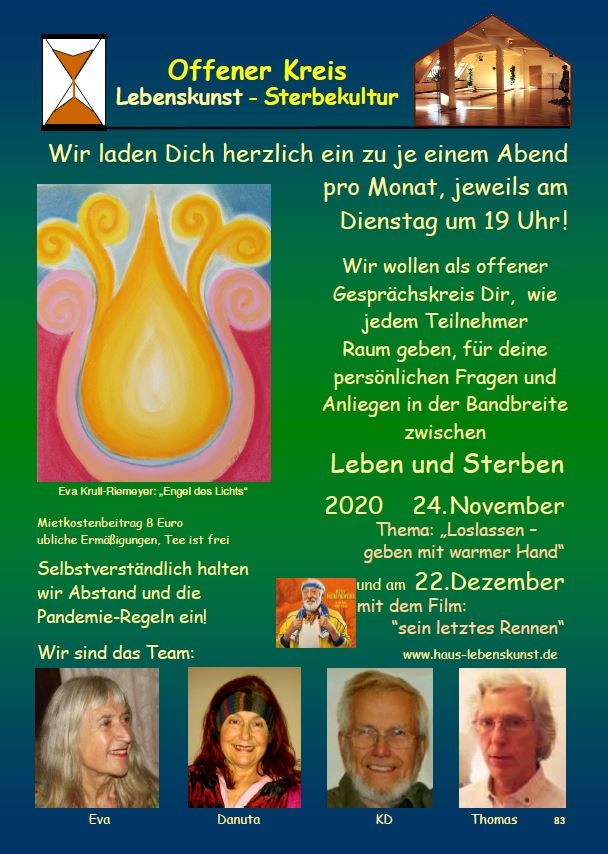Der Offene Arbeitskreis Lebenskunst - Sterbekultur lädt einmal im Monat dienstags im Haus Lebenskunst ein zu einem Gedankenaustausch.