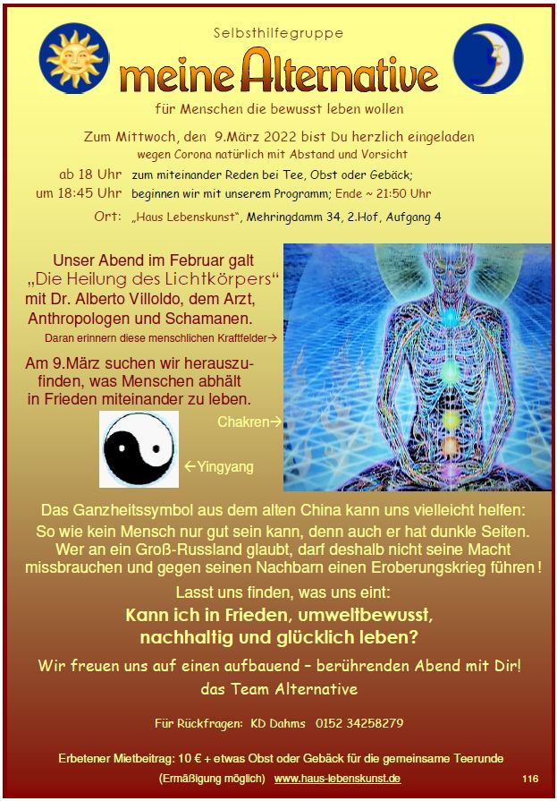 Das Team von "meine Alternative" lädt einmal im Monat mittwochs im Haus Lebenskunst zu einem gestalteten Abend ein, immer mit Gedankenaustausch.